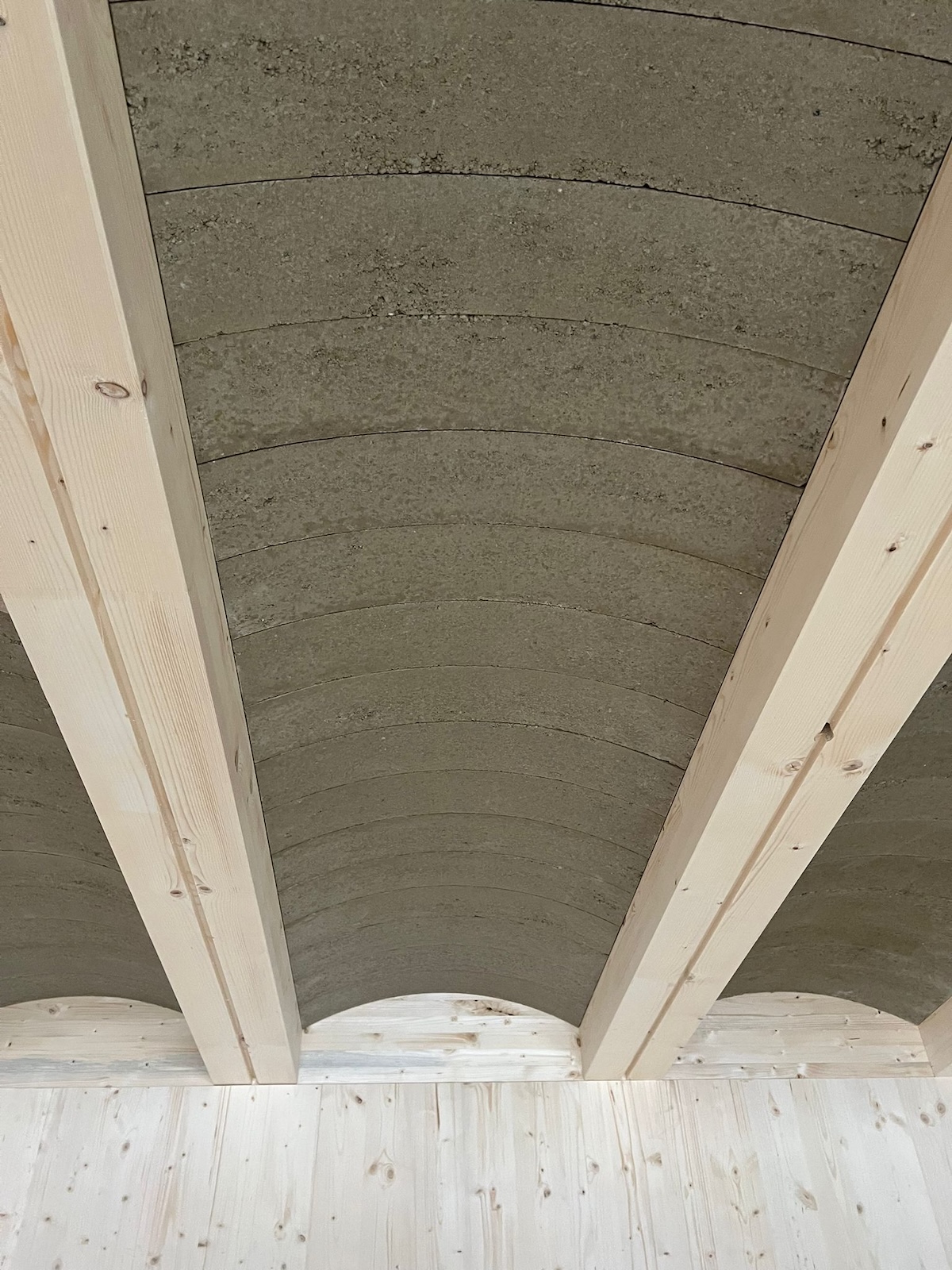 Notre bureau a opté pour une dalle mixte décarbonée au rez-de-chaussée, alliant la légèreté de la structure en bois à la rigidité des hourdis en terre crue. Cette solution innovante, développée par Terrabloc, représente une première mondiale dans l'utilisation de cette technologie. Les briques assemblées dessinent une voûte aux proportions du Ponte Vecchio de Florence, alliant esthétique et performance.