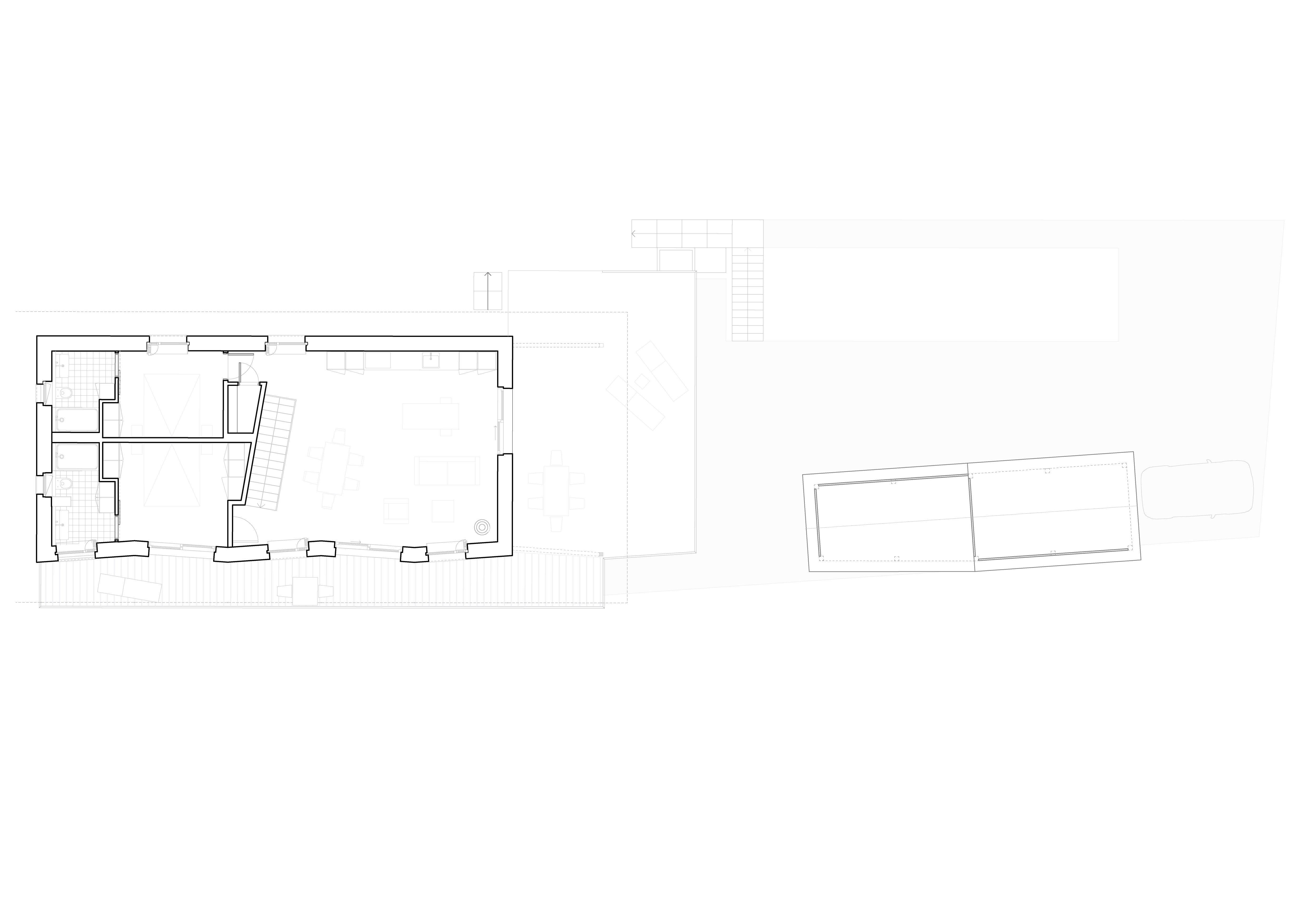 À l'extérieur, le balcon filant s'offre comme un belvédère aérien, semblant suspendu à la « toiture-montagne ». La grande terrasse, s'étire en une pente douce, se raccordant naturellement aux courbes du terrain pour offrir un lieu de contemplation serein.